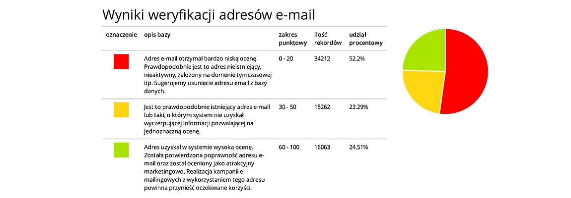 Dzięki systemowi do walidacji baz danych Expectus możesz obniżyć koszty mailingu. Ocena walidowanych rekordów pozwala wyeliminować pierwszą grupę w skali od 0-30 pkt wygenerowaną w raporcie. W tej grupie zawierają się rekordy na domenach tymczasowych, rekordy z listy robinsona, adresy na nieistniejących domenach, itd. Pozwoli to uniknąć opłat za wysyłkę e-maili do nieistniejących i błędnych adresów.