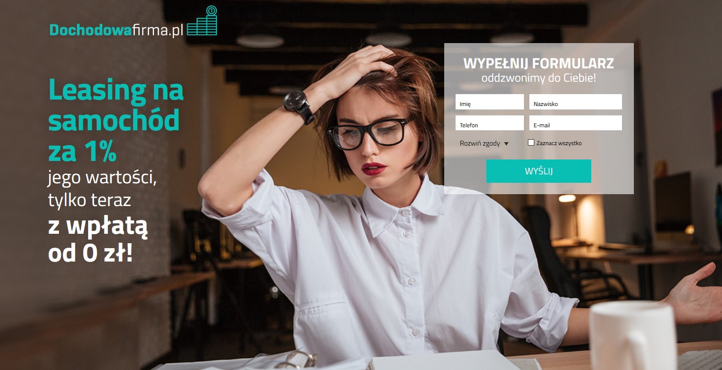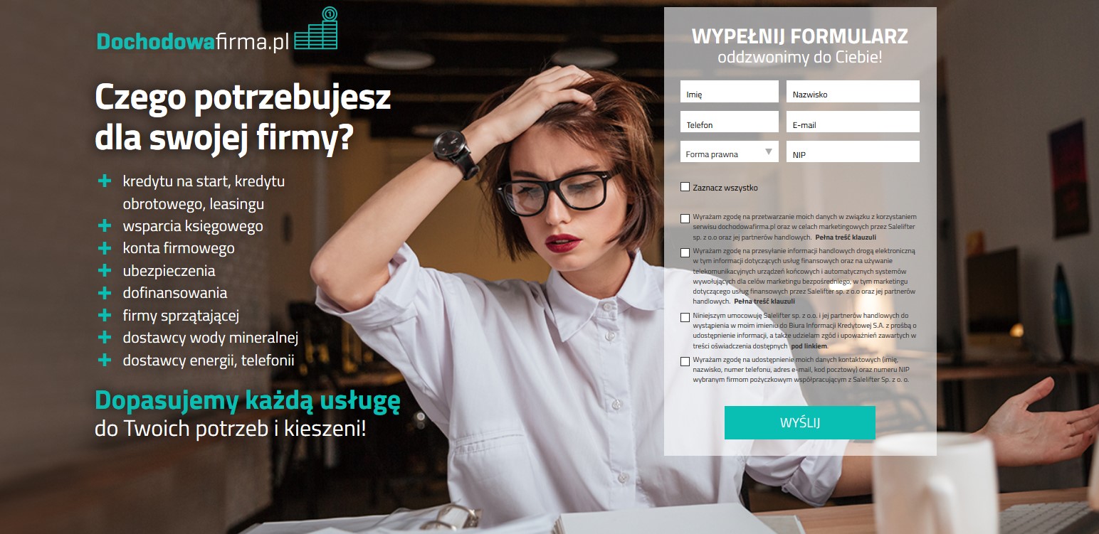 Komunikat z oferowanymi komunikatami, klarowny call to action, identyfikacja wizualna z logo dochodowafirma.pl – to najważniejsze punkty powyższego landing page. W formularzu zapisu pola z wymaganymi danymi, czyli Imię, Nazwisko, Telefon, E-mail, a także wybór formy prawnej, czyli jednoosobowa działalność gospodarcza, spółka, a także miejsce na wpisanie numeru NIP. Spójrzmy jeszcze na podobny landing page, również służący do pozyskania leadów B2B, lecz kierowany do konkretnej grupy docelowej: